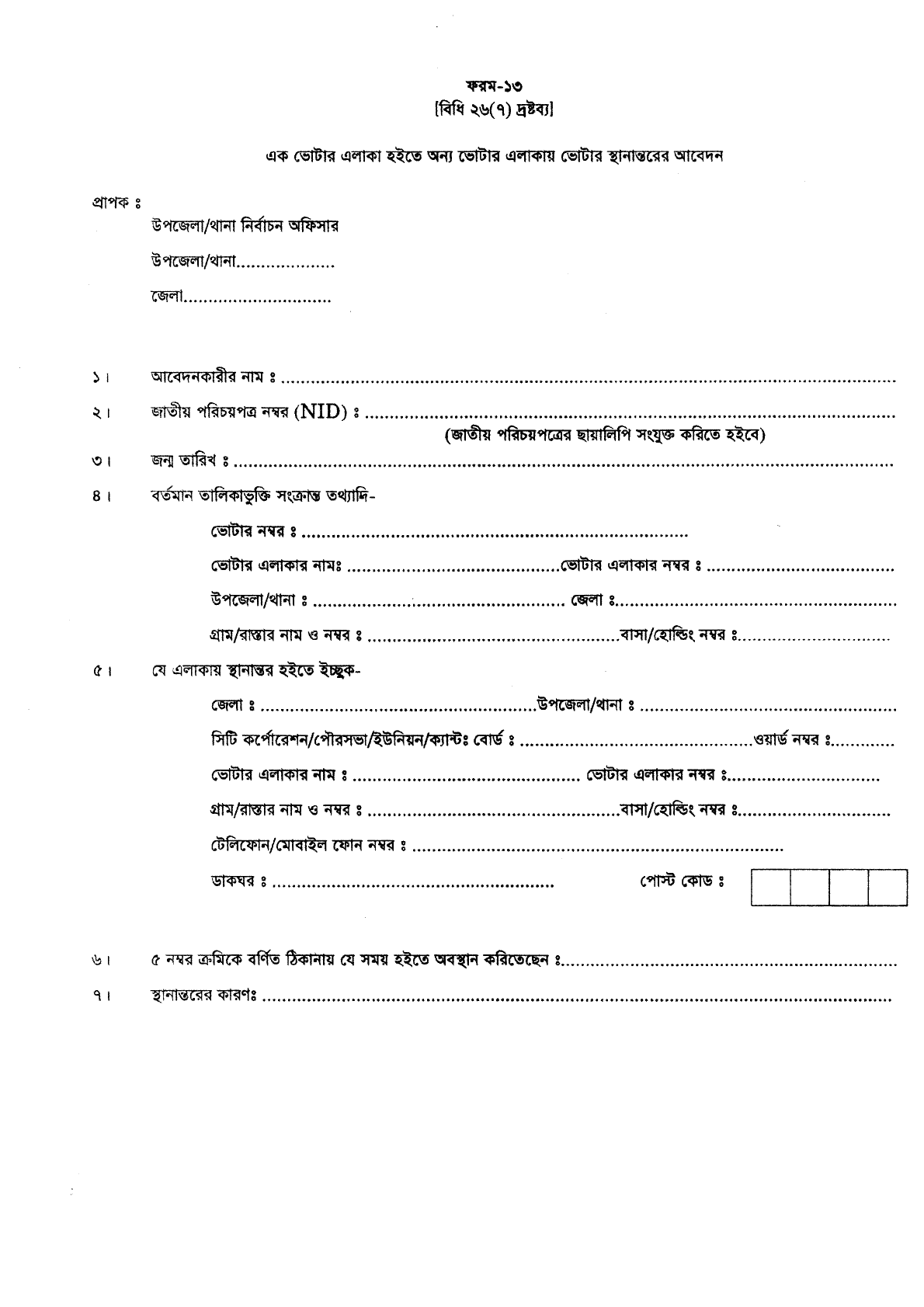 ১৩নং ফরমটি যথাযথভাবে পূরণ করে আবেদনকারীর স্বাক্ষর দিয়ে সনাক্তকারী হিসেবে এলাকার কাউন্সিলর বা মেম্বর এর স্বাক্ষর, নাম, এনআইডি নম্বর ও সিল এবং প্রত্যয়ন পত্রে মেয়র বা চেয়ারম্যানের স্বাক্ষর, নাম, এনআইড, মোবাইল নম্বর ও সিলসহ প্রয়োজনীয় কাগজপত্র সহকারে সংশ্লিষ্ট নির্বাচন অফিসে জমা দিতে হবে।